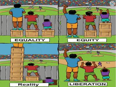 Image Credit: Equality/Equity/Liberation image is a collaboration between Center for Story-based Strategy & Interaction Institute for Social Change. "Reality" panel created by Andrew Weizeman.